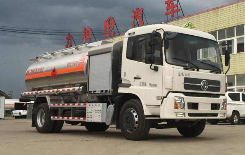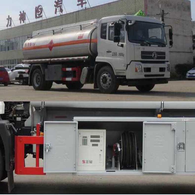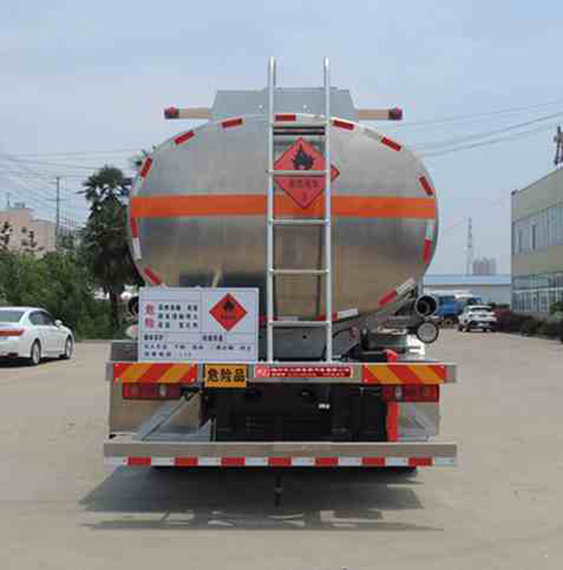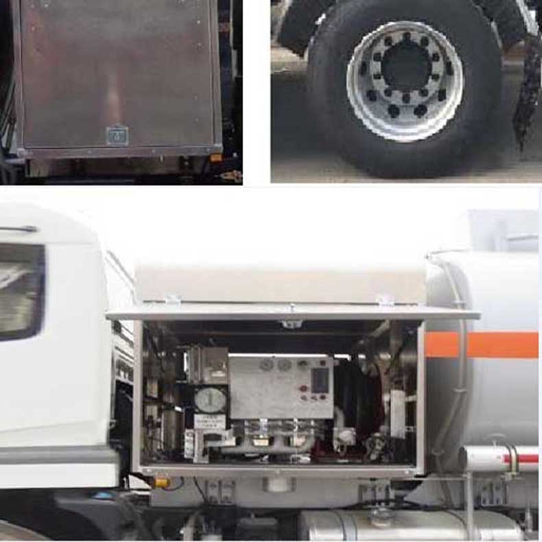 罐體有效容積:13.4立方米,危險貨物運輸車輛的類型為FL型,運輸介質:航空煤油.類項號:3;加油裝置上置時,罐體尺寸(長×長軸×短軸)(mm)為:4650×2300×1600;當加油裝置下置時,罐體尺寸(長×長軸×短軸)(mm)為:5600×2100×1450(mm).軸距/前懸/后懸對應關系為(mm):4700/1430/2470,4700/1400/2500,5000/1430/2170,5000/1400/2200;隨底盤選裝駕駛室,選裝加油機下置及專用裝置照片,選裝擋泥板樣式及加油機上置箱門和專用裝置照片;側、后防護裝置材料材質:Q235B,側、后防護均采用螺栓連接,后防護裝置斷面尺寸為(mm):80×150,后部防護離地高度:500mm;安裝具有衛星定位功能的行駛記錄儀,排氣管前置,安裝前輪盤式制動器和限速裝置,限速80km/h,僅采用底盤子午線輪胎;ABS系統型號為4460046300,生產企業為威伯科汽車控制系統(中國)有限公司.加油裝置型號/生產企業:CS20D1110F/正星科技有限公司,80YHCB-60/山東博山齊魯油泵廠,YHCB-1000/5-A,YHCB-1000/5B,YHCB-300/3-B-L/永嘉三江石油機械廠. 該車后軸為采用空氣懸架.