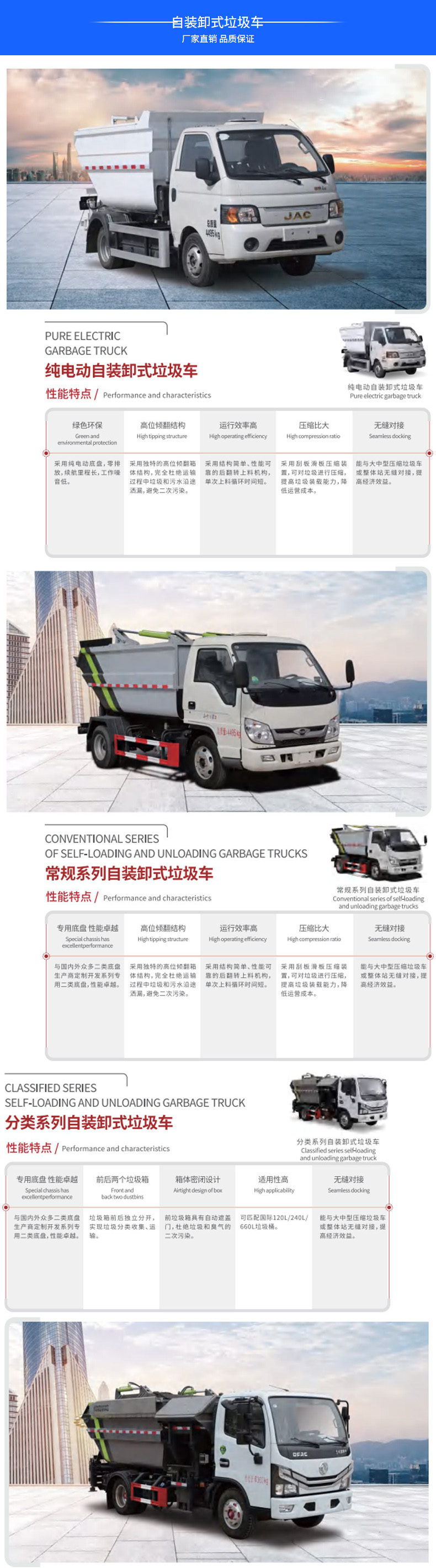垃圾車價格_純電動垃圾車_江淮小型純電動自裝卸式垃圾車★13908669111★產品名稱CSC5041ZZZJHBEV型純電動自裝卸式垃圾車,采用江淮HFC1041EV5Z底盤改裝而成,該車主要專用裝置為垃圾箱、翻轉上料裝置、舉升卸料裝置、填壓機構、液壓系統等,主要用于垃圾收集清運。卸料方式為后卸式。整車美觀大方,全液壓配置多重保護能與大中型壓縮垃圾車或整體站無縫對接,提高經濟效益。更多垃圾車盡在:m.serwongfun1895.com