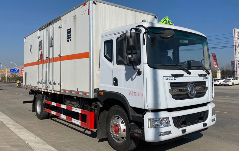 該車適用于運輸危險品。廂體頂部封閉不可開啟。運輸具有獨立容器(瓶)包裝的物品,危險貨物運輸車輛類型:EX/Ⅲ,危險貨物類項號:1.1B,1.1G,1.3C,1.1D,1.2D,1.3C,1.1C,1.4G。側,后防護材料均為Q235,側防護螺栓連接,后防護焊接,截面尺寸(mm)50×120,下邊緣離地高480mm。隨底盤選裝同系列的高頂駕駛室,選裝氣喇叭,遮陽罩,綠色濾光帶,踏步。僅選用排氣管前置、限速裝置(限速80km/h)、前輪盤式制動及子午線輪胎的底盤,后軸采用空氣懸架,轉向輪安裝輪胎爆胎應急防護裝置,安裝帶有衛星定位功能的行駛記錄儀。EBS系統型號/生產廠家:EBS/ESC-d/襄陽東風隆誠機械有限責任公司。發動機與油耗值(L/100Km)對應關系為:B6.2NS6B230/26.7,D4.5NS6B220/26.6,YCS04200-68/26.4,CY4SK761/26.8。選裝ETC。選裝尾板,尾板收起狀態水平長度為290mm,尾板質量為550kg。選裝側門型式及位置,選裝側門數量,選裝不開側門,廂體側面板選裝開百葉窗,選裝瓦楞板結構。選裝燃油箱,電瓶,尿素罐,儲氣筒左右安裝位置。隨底盤選裝駕駛室,選裝前組合燈具,前面罩和后視鏡.
